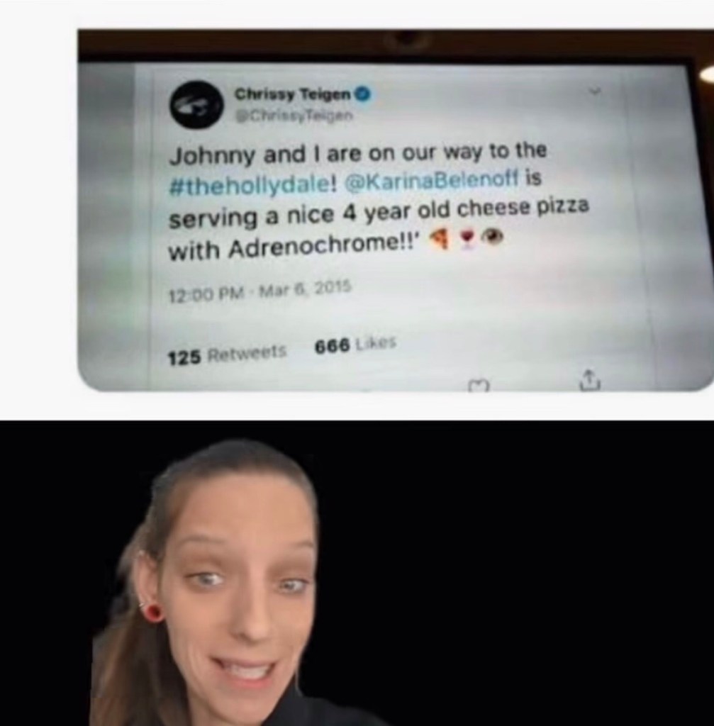 Chrissy Teigen, I’d like to thank you for incriminating the shit out of everyone by proving Adrenochrome is real. For the unaware, you can only produce Adrenochrome from the blood of a scared child. These kids are tortured and abused physically and sexually to do so. This is how octogenarian Mick Jagger was able to run across stage, along with siphoning energy, especially through sex magic. It’s also how celebrities maintain youth.