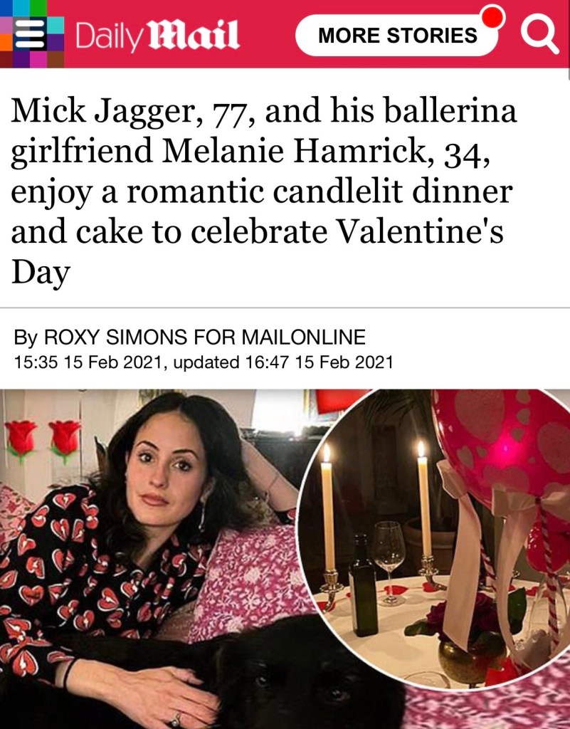 Every year since I “dated” Mick Jagger, who I never would’ve given the time of day if my memories weren’t glamour magicked, Melanie Hamrick has fabricated Valentine’s Day romance (read More Memory Glamour Evidence). Raggedy Anne does all this shit and pretends Mick did it for her. Subsequently getting the media to perpetuate her lies, paying them to publish the story. The rockstar doesn’t give a fuck about anyone beyond himself. Not a soul.