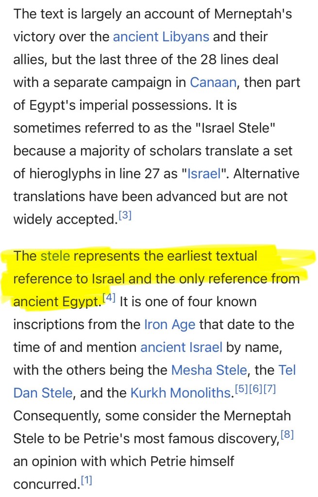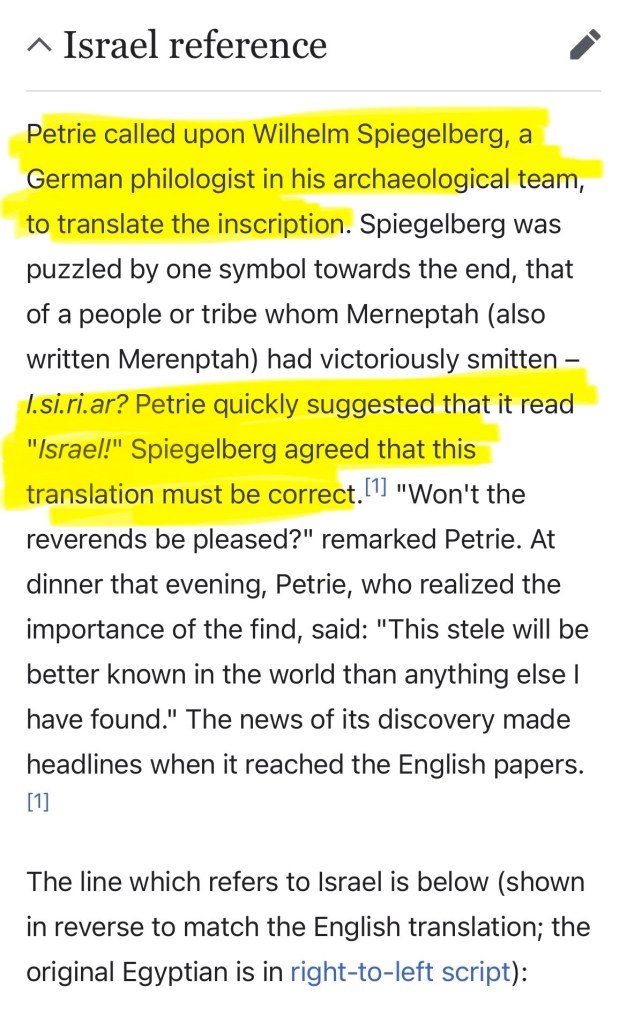 Cut to them citing the Merneptah Stele to establish their inhabitancy and existence in the area. Conjecture. All this pieces or archeology did was solidify they rewrote the Bible in the 1800’s, used it to spread propaganda of the Rothschilds creation causing Christian Zionist like Flinders Petrie to view them as God’s chosen people. Precisely why he asked Jewish Egyptologist Wilhelm Spielgelberg to transcribe the hieroglyphic, which according the story he couldn’t understand, leading the former to scream Israel. To validate the Bible the Rothschilds edited for their political agenda, like many men and religious groups before them.
