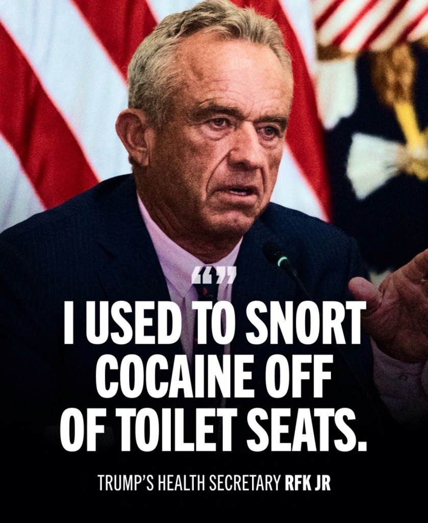 I use to be a top tier party girl and at no point is RFK Jr’s behavior justifiable. Snorting cocaine off toilet seats, as in multiple times? This is dirty white behavior. You don’t have a portable mirror? A credit card? A fucking key? I’m just SO CONFUSED. Surfaces are EVERYWHERE and you choose a toilet seat? To crouch down and cut lines where people rid themselves of waste? What the actual fuck is wrong with you? You’re a nepo-baby for Christ sakes. There’s literally no reason to resort to this. Via: TheDemocrats