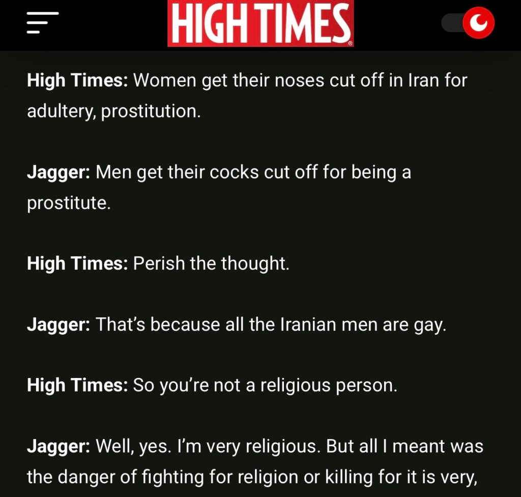 I’ve already established Mick Jagger, aka The Devil, incarnated before all the Divines to get a head-start (read Revelation 9: The Antichrist Is…). Keeping tabs on us. The ultimate misogynist, he created the Iranian Revolution in order to kill Tali Farhadian Weinstein. She’s Nike (read Revelation 4: Tali Is Nike Incarnate). Here’s the High Times interview that led me to the discovery. Michael Philip Jagger names his favorite places to visit. Emphasizing an admiration of Tehran.
