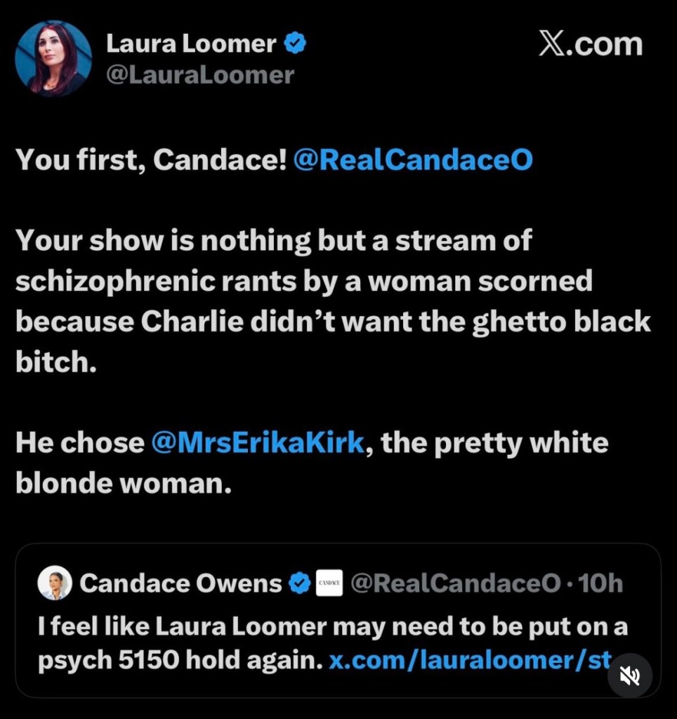 Imagine looking like this, before and after plastic surgery and having the temerity to comment on someone. Laura Loomer doesn’t even have a man, but took to social media with delusions of white beauty after Candace Owens rightfully claimed she belonged in another 51/50 hold. Loomer responded by having a dirty white, inbred tantrum, making claims that Charlie Kirk chose Erika Kirk over Owens, because she’s white and Owens needs to get over it.