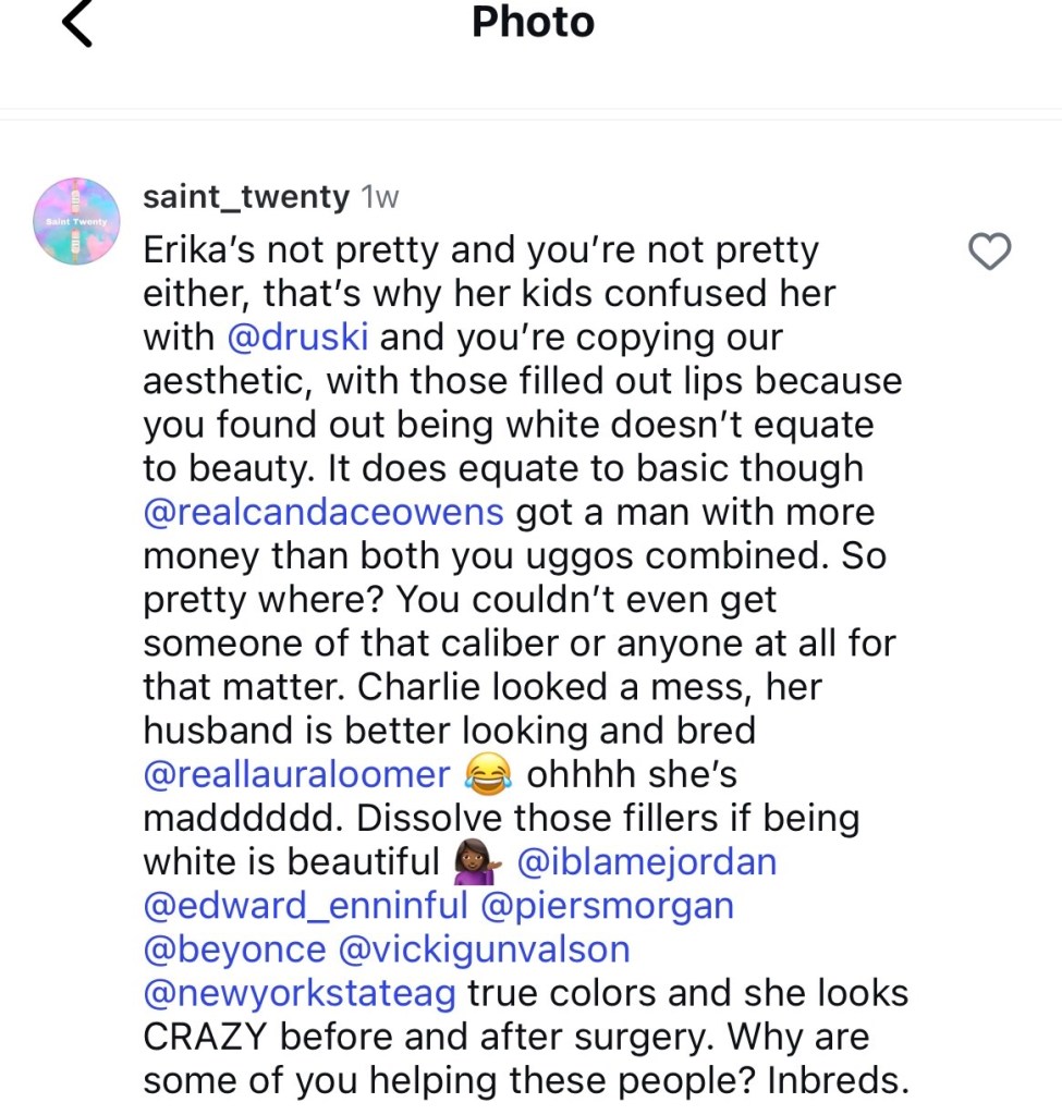 This is where I interjected. Neither she nor Erika big face fucking Kirk are beautiful. Her children thought Druski was their mama (read Druski In Whiteface Is Reparations). That’s one. Two Loomer chose to copy the black aesthetic with fuller lips, hate us cause you ain’t us. I’d be mad if I looked like that too, before and after surgery. She needs to sue her parents, her doctor, and quite possibly God for doing her like that.