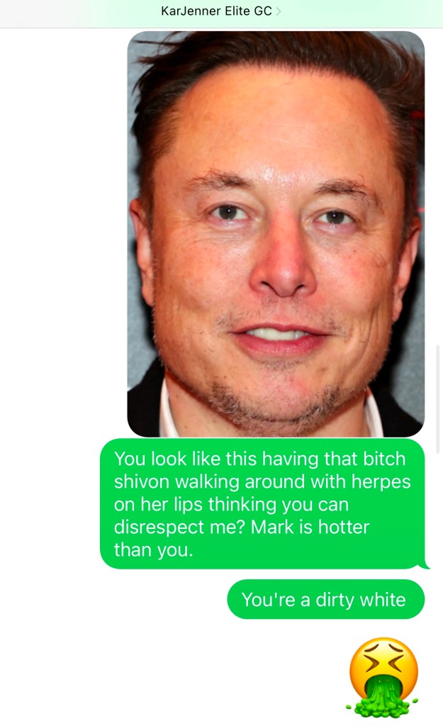 Not only did I send it to the group chat. Which is a burner number connecting to everyone’s real numbers, after they violated my privacy in a hate crime (read How The Kardashian Jenners Got My Info), but I dragged him for having Shivon Zilis walking around with herpes. He’s gross, a satanic pedo spreading his filth to victims, including children. This is the American government, garbage. I’m allowing people to take power back, while I learn these idiots.