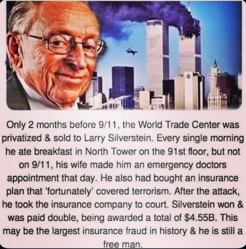 The proof is in the pudding my nigga. Larry Silverstein in cahoots with Israel and the Rothschilds, purchased the World Trade Center properties to demolish them for financial gain. Prior to 9/11 there had never been attacks on American soil, which is what made the ordeal jarring. And yet, Larry Silverstein had the foresight to purchase insurance for terrorist attacks, which at the time would seem a waste of money based on the aforementioned fact.