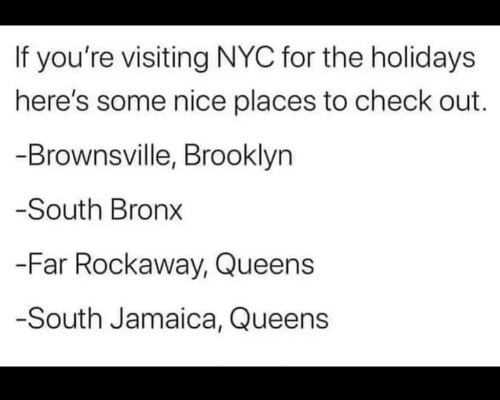 After growing up on the Upper East Side, I’ve lived in every borough except Staten Island. The first time I’d been to Brownsville I had no idea what neighborhood I was in. Returning to my Crown Heights apartment from a night out, I was grateful Uber existed, viewing the landscape through the car windows. I remember the days when it didn’t, too late to wave down a taxi, I might’ve had to walk through those streets. The vibe was haunting, scary. Never again have I gone over there. Fuck around and find out. Via: NewYorkers