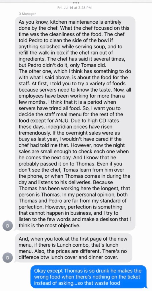 My final shift was August 4th, Derek showed up wasted at 3am to fire me, but kept inexperienced white server Mochin (who gave Guillermo the soju). The chef scheduled one cook, alcoholic Thomas who said fuck you, I’m not making the jokbal again and walked out. I had to shut down the entire restaurant on a busy Thursday night. Mochin after three months, still couldn’t identify the dishes nor complete the simple task of delivering food to the right table. All he had to do was go to A9, as instructed, he went to A1 causing nearly an hour delay for the former. Mochin also offended customers continuing to call them Chinese, after I asked him to stop.
