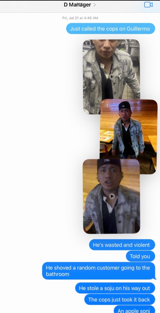 Later that night Tony attacked another customer, an Indian woman who was drunk and feeling her oats. Tony told her to shut up. Uncomfortable with his demeanor towards brown people, I messaged Derek. Tony tried to throw his weight around, yelling at me not to speak to the kitchen, he’ll do it. I dragged him. I’d been working there without him, the fuck. Esteban the overnight supervisor (a position created to supplement Derek’s unwillingness to make appearances), also complained about him. Their first shift together, Tony tried to fight Esteban outside, interrupting service. Derek didn’t care, keeping him on until he found out Tony was running his mouth. I repeated verbatim what Derek said to him privately, and things I had no way of knowing having been excluded from the employee group chat. So it’s no surprise I was let go after standing up for the one cook Pedro, who held everything together (read It Costs To Be The Boss).