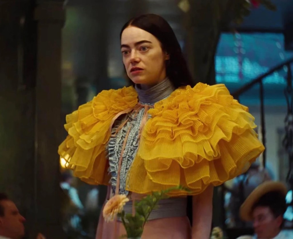 Emma Stone’s award winning performance as reanimated Bella Baxter in Poor Things, has officially entered the annals of Halloween classics. As she grew from child to woman Bella Baxter served looks, topped with iconic brows and hair. Being Bella requires rocking 32 inch tresses loose or braided, ruffles, ginormous shoulders (I’m talking 80’s shoulder pads on steroids), bold color play and high necklines. A cute little consignment shopping, thrift store run, will definitely yield some necessary purchases for this costume. Which look is your favorite? Via: Vanity Fair, People, The New York Times, The Guardian, CNN, Digital Spy & Alamy
