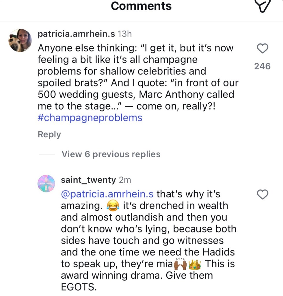 This comment about champagne problems has me cackling. The Beckham family feud is award winning perfection (read The Beckham Family War Is Top Tier). While the investigation regarding who’s to blame for the rift is ongoing, what we can confirm is Marc Anthony is guilty and messy af.