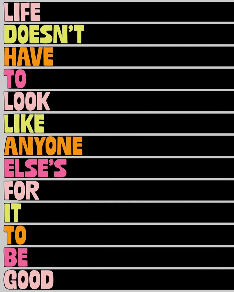 All too often we forget we’re individual people with individual purposes. You are unique. The only you there will ever be. The cookie cutter formula for life is an illusion. Everyone has their own path to follow. Accept yours, compare you now to the past version of yourself, not to someone else. The definition of a good life is different for everyone. Artist: Tyler_Spangler